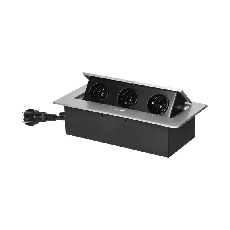 Srebrne gniazdo meblowe wpuszczane w blat 3x2P+Z z płaskim frezowanym rantem i przewodem 1,5m OR-GM-9033/G ORNO