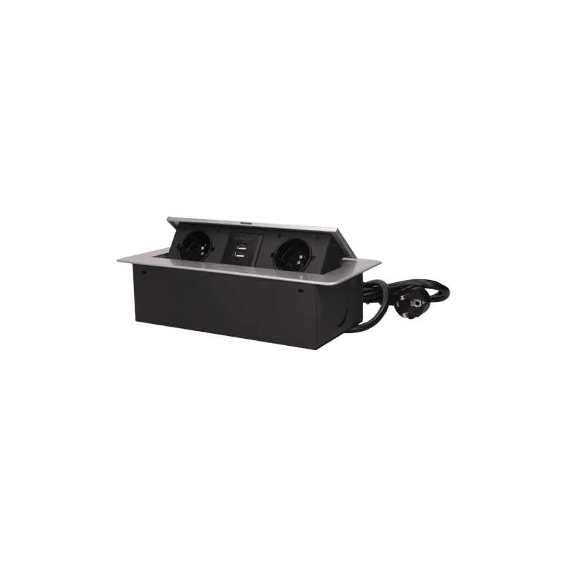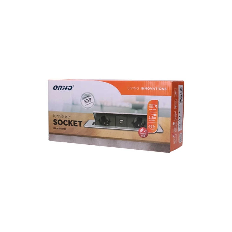 Gniazdo blatowe wpuszczane z dwoma portami USB OR-AE-13126/G firmy ORNO to nowoczesne urządzenie, które znajdzie zastosowanie w biurach, domach czy salach konferencyjnych. Produkt został wyposażony w uziemienie, przesłony torów prądowych, dwa gniazda sieciowe oraz ładowarkę USB. Gniazdo meblowe przeznaczone jest do montażu w biurkach, blatach oraz stołach i prezentuje się niezwykle estetycznie i może być montowane zarówno pionowo, jak i poziomo, zapewniając dostęp do gniazd elektrycznych. Maksymalne obciążenie produktu to 2500W. Gniazdo zostało wyposażone w płaski frezowany rant o grubości 2mm. Panel z gniazdami otwiera się w sposób płynny po naciśnięciu przycisku. Zestaw wyposażony jest w przewód o długości 3 m.