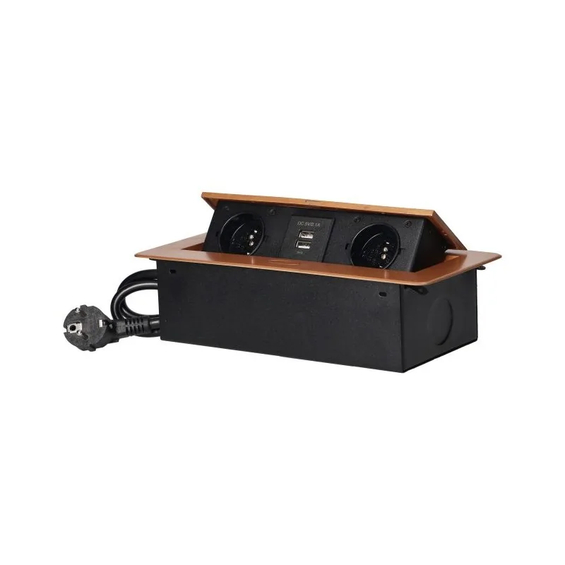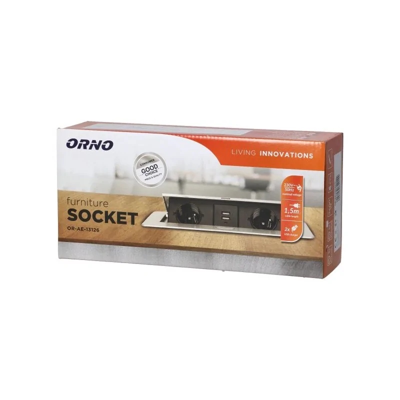 Gniazdo blatowe to zestaw dwóch gniazd sieciowych z uziemieniem i przesłonami torów prądowych, połączonych z ładowarką USB w obudowie chowanej w blat. Urządzenie marki ORNO, przeznaczone jest do montażu w biurkach, blatach i stołach, może być zamontowane zarówno w pozycji pionowej jak i poziomej, zapewniając wygodny dostęp do gniazd elektrycznych. Dzięki płaskiemu rantowi (zaledwie 2 mm) obudowa z gniazdami doskonale wpasowuje się w płaszczyznę np. stołu i nie przeszkadza w jego czyszczeniu. Zestaw posiada fabrycznie zamontowany kabel o długości 1,5m. Pokrywa gniazda jest w szykownym złotym kolorze.