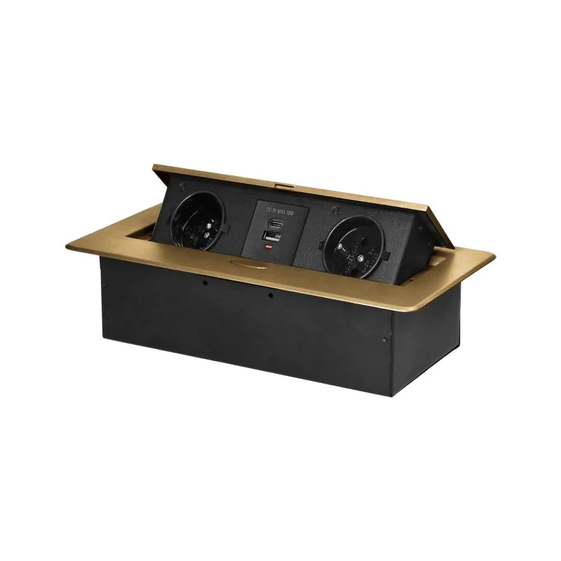 Złote, malowane proszkowo powierzchnie gniazda dobrze zgrywają się z wykończeniem większości mebli oraz kolorystycznie wpasują się w większość aranżacji. Dopracowany kształt sprawia, że wykorzystanie gniazda wpuszczanego w blat jest stylową alternatywą dla zwykłych przedłużaczy czy listwy zasilającej, a do tego pozwala skutecznie uniknąć splątanych kabli.