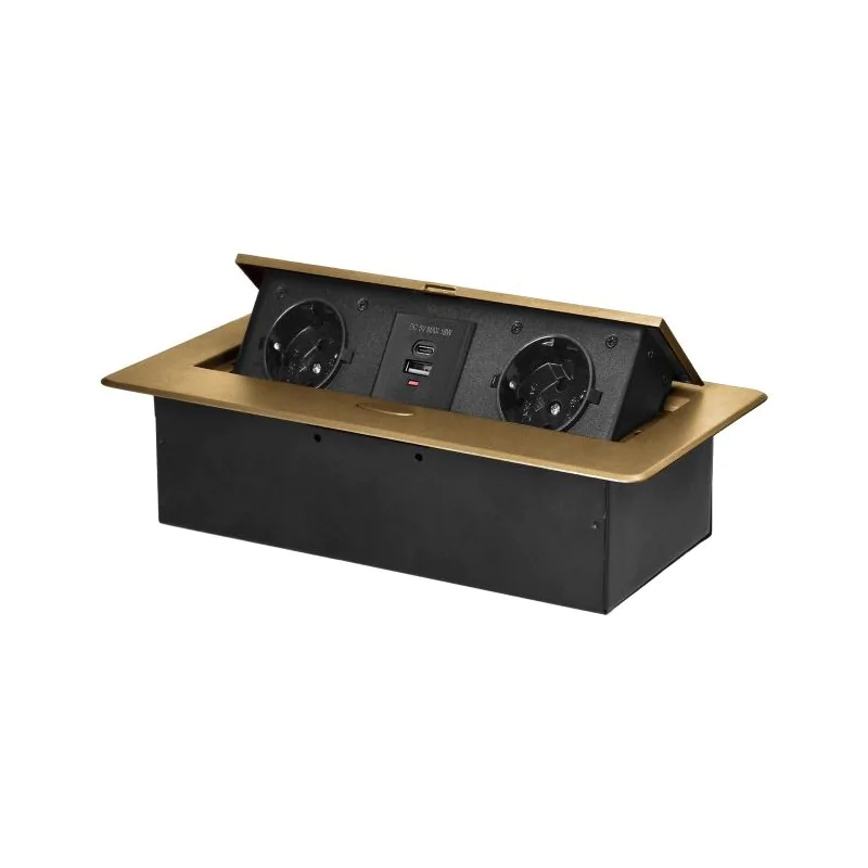 Złote, malowane proszkowo powierzchnie gniazda dobrze zgrywają się z wykończeniem większości mebli oraz kolorystycznie wpasują się w większość aranżacji. Dopracowany kształt sprawia, że wykorzystanie gniazda wpuszczanego w blat jest stylową alternatywą dla zwykłych przedłużaczy czy listwy zasilającej, a do tego pozwala skutecznie uniknąć splątanych kabli.