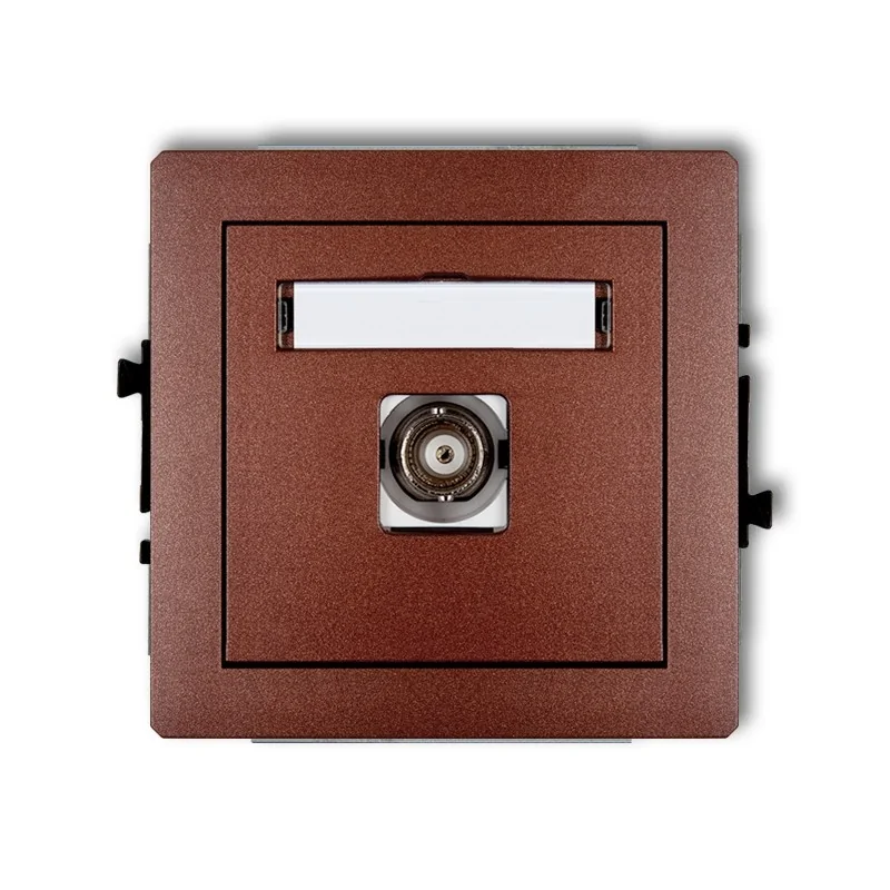 Gniazdo pojedyncze BNC serii DECO marki KARLIK wyposażone zostało w złącze koncentryczne, które służy do przesyłania delikatnych i słabych sygnałów. Obudowa gniazda jest w kolorze brązowym. Gniazdo BNC przeznaczone jest do montażu podtynkowego i sprzedawane jest bez ramki w zestawie. W serii DECO dostępne są ramki w krotnościach 1-5 w różnych kolorach. W ofercie znajdują się również ramki wypełniające- niweluje szczelinę pomiędzy ramką standardową, a ścianą (opcja dodatkowa) oraz pośrednie w bogatej kolorystyce, co pozwala na stworzenie własnej kompozycji.