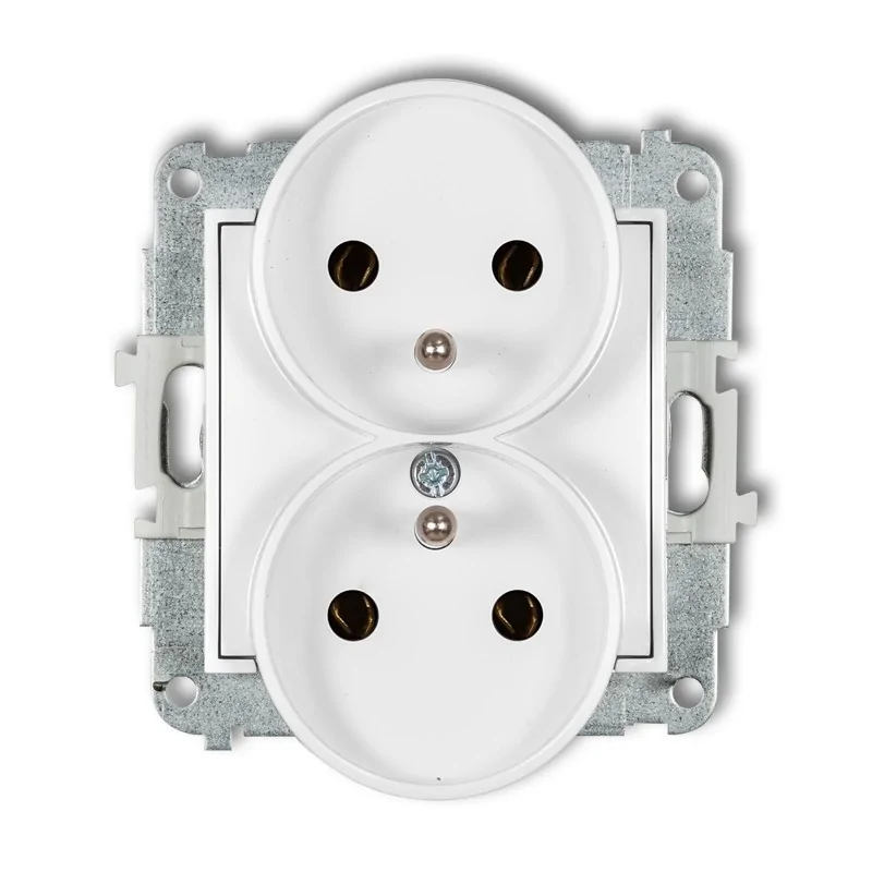 Gniazdo podwójne z uziemieniem i bez przesłon torów serii MINI firmy KARLIK, przeznaczone do montażu podtynkowego. Gniazdo wymaga dokupienia ramki serii MINI firmy KARLIK.