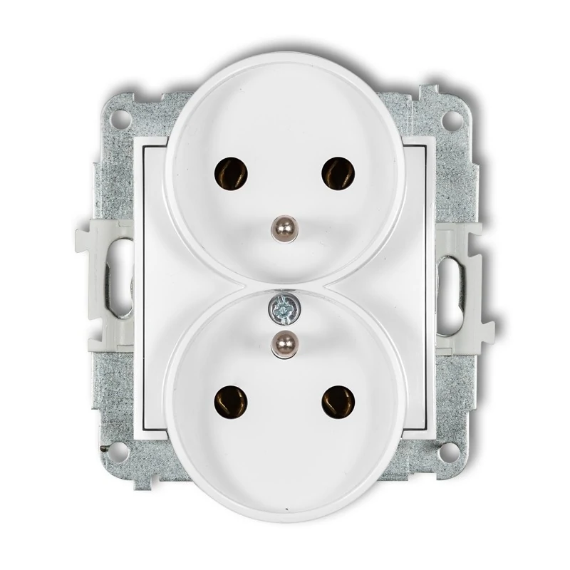 Gniazdo podwójne z uziemieniem i przesłonami torów serii MINI firmy KARLIK, przeznaczone do montażu podtynkowego. Gniazdo wymaga dokupienia ramki serii MINI firmy KARLIK.