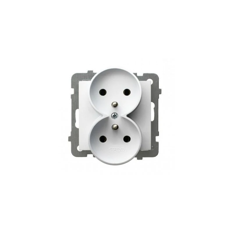 Podwójne gniazdo z uziemieniem w kolorze białym serii AS firmy OSPEL przeznaczone do montażu podtynkowego. Gniazdo wymaga dokupienia ramki serii AS firmy OSPEL.