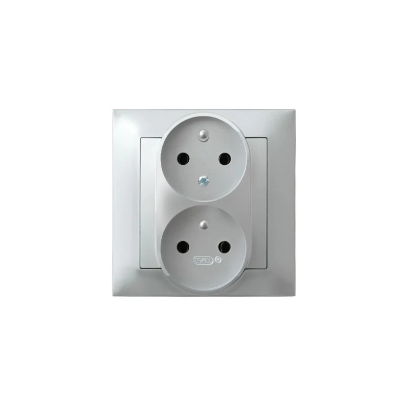 Podwójne srebrne gniazdo elektryczne z uziemieniem, z funkcją niezamienności faz serii IMPRESJA firmy OSPEL, sposób montażu: podtynkowy. Produkt sprzedawany z ramką w komplecie.