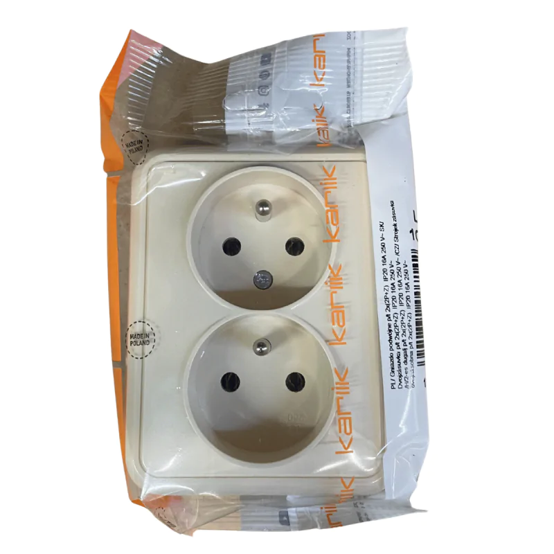 Gniazdo elektryczne podwójne CZESKIE w kolorze beżowym 1GPD-2Z serii LIZA marki KARLIK. Gniazdo sprzedawane jest z ramką w komplecie w wersji monoblok.