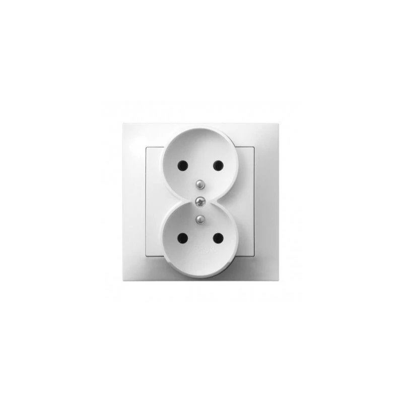 Podwójne gniazdo elektryczne z uziemieniem, z ramką serii IMPRESJA firmy OSPEL w kolorze białym. przystosowane do montażu podtynkowego.