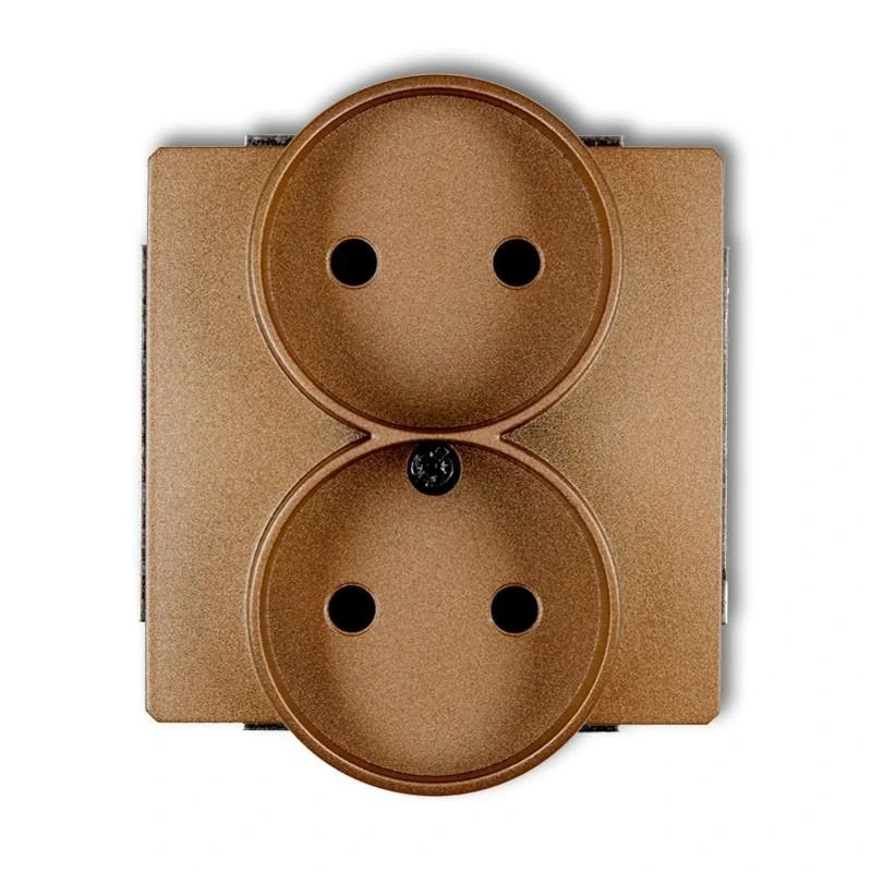 Podwójne gniazdo bez uziemienia w kolorze złotym serii DECO firmy KARLIK, przeznaczone do montażu podtynkowego. Gniazdo wymaga dokupienia ramki serii DECO firmy KARLIK. Produkt nie jest kompatybilny z ramkami DECO Soft.