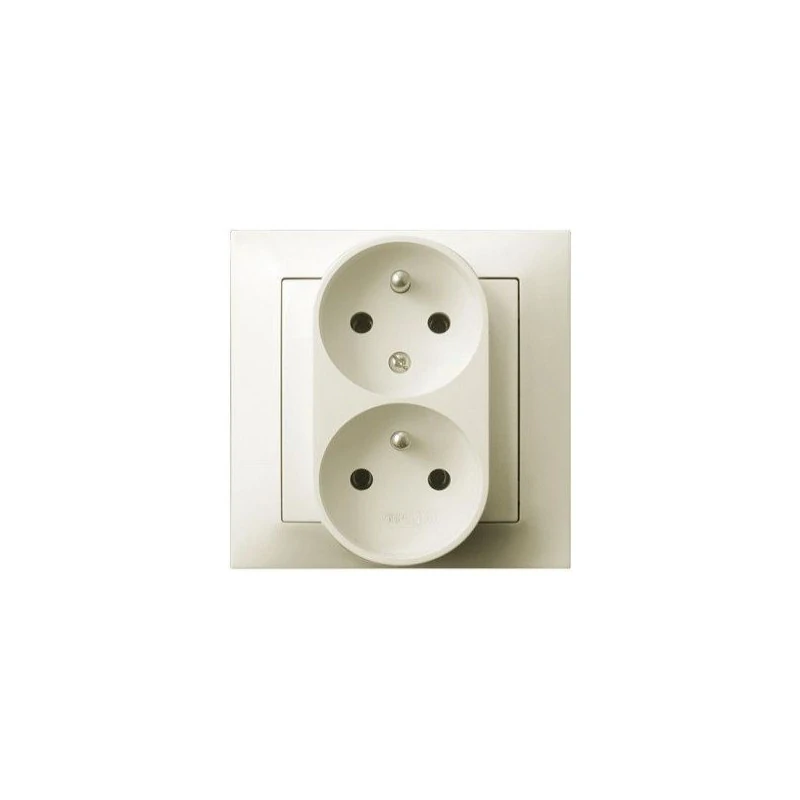 Podwójne gniazdo elektryczne z uziemieniem i funkcją niezamienności faz serii IMPRESJA firmy OSPEL w kolorze ECRU. Gniazdo przeznaczone do montażu podtynkowego.