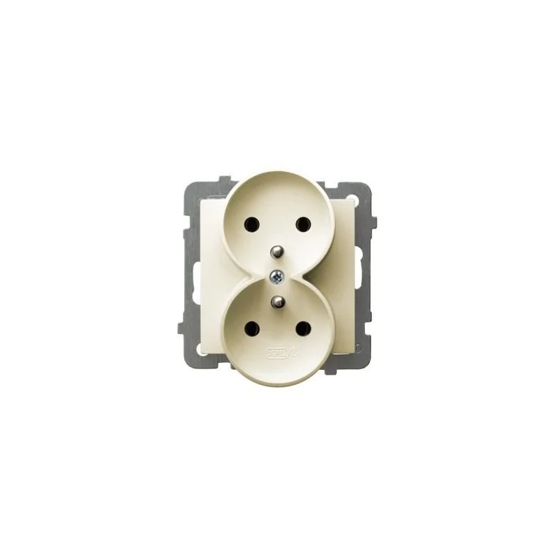 Podwójne gniazdo elektryczne z uziemieniem w kolorze ECRU, przeznaczone do montażu podtynkowego serii AS firmy OSPEL. Gniazdo wymaga dokupienia ramki serii AS firmy OSPEL.