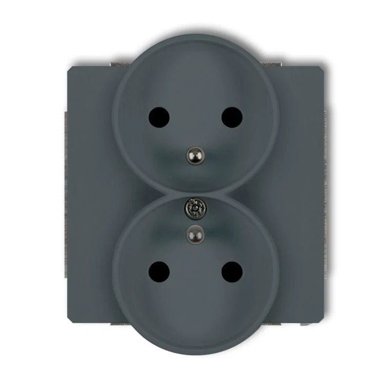 Podwójne gniazdo z uziemieniem serii DECO firmy KARLIK w kolorze grafitowym, przeznaczone do montażu podtynkowego. Gniazdo wymaga dokupienia ramki serii DECO firmy KARLIK. Gniazdo nie pasuje do ramkami DECO Soft.