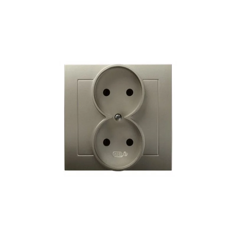 Podwójne gniazdo elektryczne bez uziemienia w kolorze satynowym serii KIER firmy OSPEL, przeznaczone do montażu podtynkowego. Gniazdo posiada w komplecie ramkę.