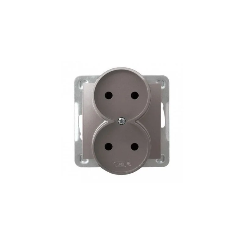 Podwójne tytanowe gniazdo elektryczne bez uziemienia serii IMPRESJA firmy OSPEL, przeznaczone do montażu podtynkowego. Gniazdo wymaga dokupienia ramki serii IMPRESJA firmy OSPEL.