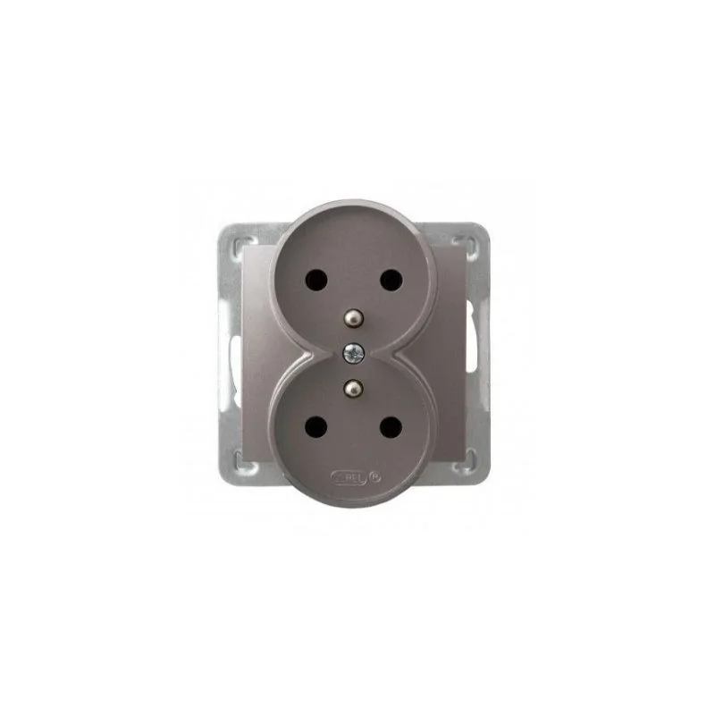 Podwójne tytanowe gniazdo elektryczne z uziemieniem serii IMPRESJA firmy OSPEL, przeznaczone do montażu podtynkowego. Gniazdo wymaga dokupienia ramki serii IMPRESJA firmy OSPEL.