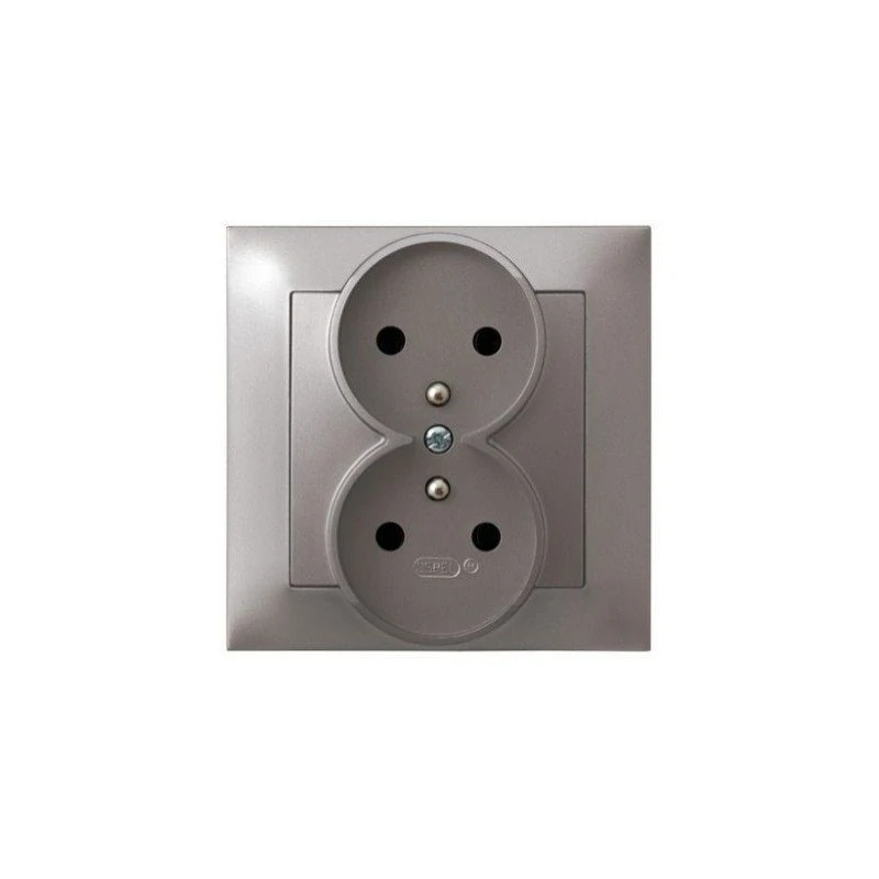 Podwójne tytanowe gniazdo elektryczne z uziemieniem z ramką serii IMPRESJA firmy OSPEL, przeznaczone do montażu podtynkowego.