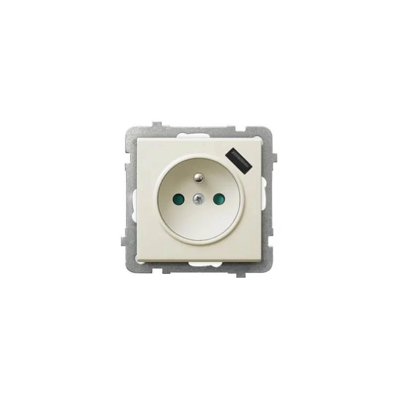 Gniazdo elektryczne połączone z ładowarką USB GP-1RZPUSB/m/27 w kolorze beżowym, seria Impresja firmy Ospel. Podtykowe gniazdko 230V z funkcją ładowania 5V USB. Dodatkowo do gniazda USB należy skompletować ramkę z rodziny produktów Impresja.