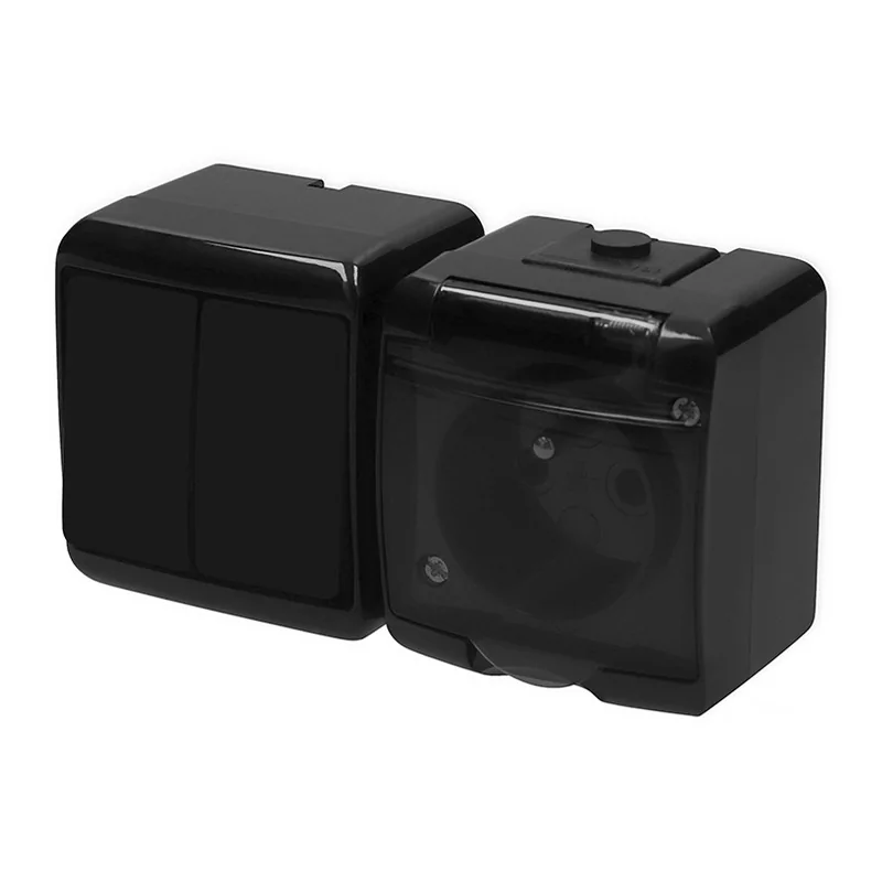 Zestaw 12WGHH-2d to komplet poziomy będący połączeniem łącznika świecznikowego z gniazdkiem hermetycznym zamykanym klapką dymną. Mix poziomy 12WGHH-2 występuje w czarnej wersji kolorystycznej, odpornej na działanie promieni UV - kolor jest trwały, nie odbarwia się - łatwo utrzymać go w czystości. Zestaw pochodzi z linii JUNIOR o podwyższonej klasie szczelności, wynoszącej IP54. Komplet przeznaczony jest do montażu natynkowego. Gniazdo z klapką posiada bolec uziemiający bez osłony styków prądowych. Przełącznik podwójny umieszczony przed gniazdem może zostać wykorzystany do załączania oświetlenia lub innych sprzętów elektrycznych w Twojej pracowni, magazynku czy warsztacie lub w innych pomieszczeniach narażonych na podwyższony poziom wilgoci lub wysokie zapylenie.