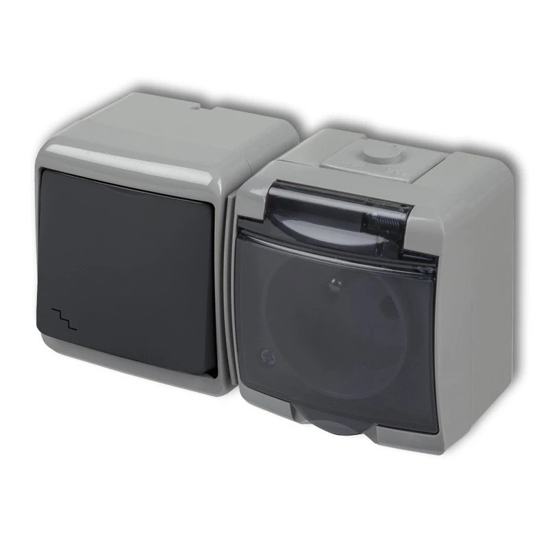 Grafitowo- szary włącznik światła podwójny z gniazdem IP54 poziom 30WGHH-2d JUNIOR KARLIK