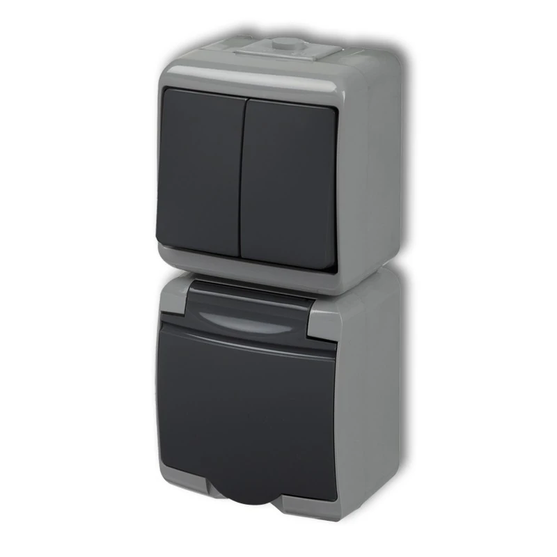 Popielaty włącznik podwójny z gniazdem hermetycznym w pionie 10WGHP-2p JUNIOR KARLIK