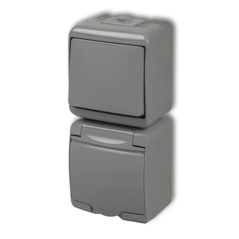 Zestaw 10WGHP-1p to komplet pionowy będący połączeniem łącznika jednobiegunowego z gniazdkiem hermetycznym zamykanym klapką. Mix pionowy 10WGHP-1p występuje w popielatej wersji kolorystycznej, odpornej na działanie promieni UV - kolor jest trwały, nie odbarwia się - łatwo utrzymać go w czystości. Zestaw pochodzi z linii JUNIOR o podwyższonej klasie szczelności, wynoszącej IP54. Komplet przeznaczony jest do montażu natynkowego. Gniazdo z klapką posiada bolec uziemiający oraz osłony styków prądowych. Przełącznik jednobiegunowy umieszczony nad gniazdem może zostać wykorzystany do załączania oświetlenia lub innych sprzętów elektrycznych w Twojej pracowni, magazynku czy warsztacie lub w innych pomieszczeniach narażonych na podwyższony poziom wilgoci lub wysokie zapylenie.
