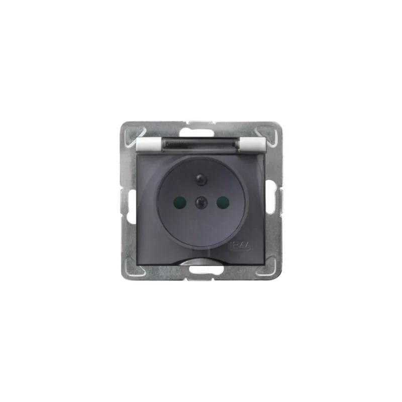 Gniazdo elektryczne bryzgoszczelne z uziemieniem i przesłonami torów serii IMPRESJA firmy OSPEL, przeznaczone do montażu podtynkowego. Gniazdo wymaga dokupienia ramki serii IMPRESJA firmy OSPEL.