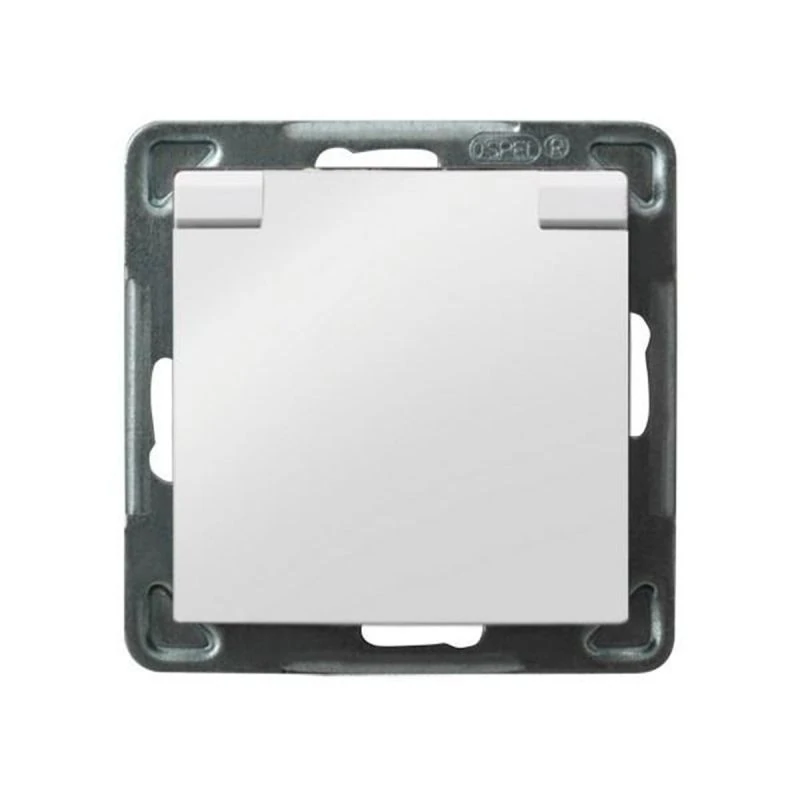 Gniazdo elektryczne, bryzgoszczelne z uziemieniem i z klapką koloru białego serii IMPRESJA firmy OSPEL, sposób montażu: podtynkowy. Gniazdo wymaga dokupienia ramki serii IMPRESJA firmy OSPEL.