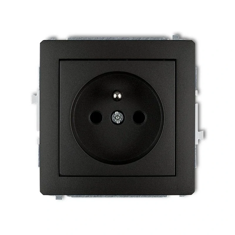 Gniazdo pojedyncze z uziemieniem serii DECO firmy KARLIK w kolorze czarnym, przeznaczone do montażu podtynkowego. Gniazdo wymaga dokupienia ramki serii DECO firmy KARLIK.