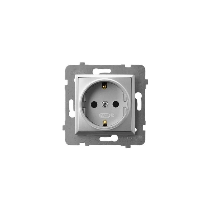 Gniazdko elektryczne pojedyncze GP-1US/m/18 serii ARIA firmy OSPEL przeznaczone jest do montażu podtynkowego. Nowoczesne gniazdko elektryczne serii ARIA sprzedawane jest bez ramki w zestawie, dzięki czemu możesz dokupić ją według swoich upodobań. Pojedyncze gniazdo podtynkowe jest w kolorze srebrnym i posiada uziemienie typu Schuko. Kontakty elektryczne serii ARIA firmy OSPEL dostępne są również w innych kolorach. Gniazdo elektryczne GP-1US/m/18 posiada stopień odporności IP20.