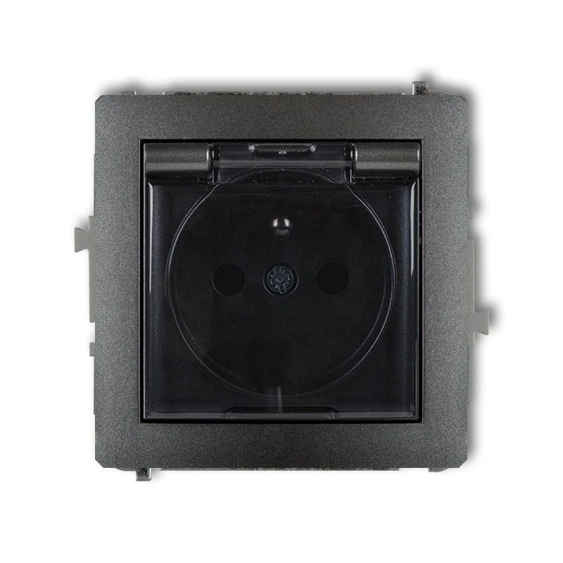 Gniazdo z klapką dymną i uziemieniem w kolorze grafitowym, o stopniu ochrony IP44 serii DECO firmy KARLIK, przeznaczone do montażu podtynkowego. Gniazdo wymaga dokupienia ramki serii DECO firmy OSPEL.