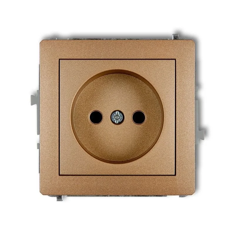 Pojedyncze gniazdo bez uziemienia w kolorze złotym serii DECO firmy KARLIK, przeznaczone do montażu podtynkowego. Gniazdo wymaga dokupienia ramki serii DECO firmy KARLIK.