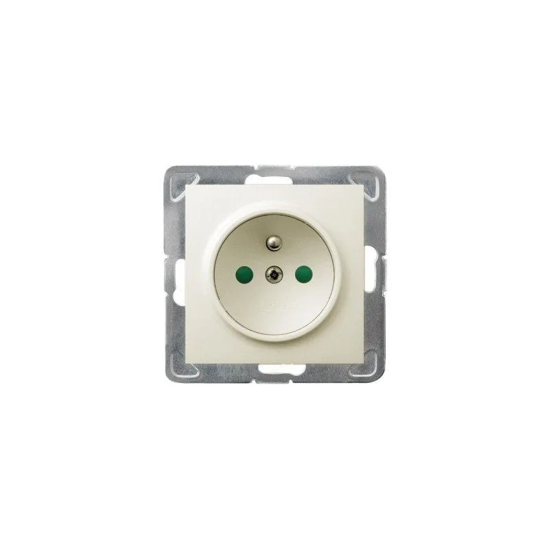 Pojedyncze gniazdo elektryczne z uziemieniem i przesłonami torów z serii IMPRESJA firmy OSPEL w kolorze ECRU, przeznaczone do montażu podtynkowego. Gniazdo wymaga dokupienia ramki serii Impresja firmy Ospel.