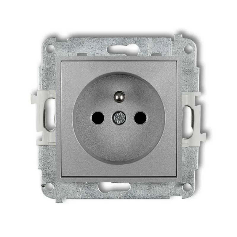 Gniazdo elektryczne pojedyncze 7MGP-1zp serii Deco Mini marki Karlik w kolorze srebrnym metalicznym przeznaczone jest do montażu podtynkowego. Gniazda pojedyncze MINI posiadają wbudowane przesłony torów prądowych, zabezpieczające dzieci przed dostępem do części niebezpiecznych instalacji elektrycznej. Mechanizmy i ramki Deco Mini sprzedawane są osobno. Do gniazda pojedynczego należy dokupić ramkę instalacyjną, która dostępna jest w różnych kolorach i krotnościach- od pojedynczej, po pięciokrotną. Ramki serii MINI to najmniejsze (zaledwie 80,0mm x 80,0mm x 6,3mm), dostępne na polskim rynku produkty tego typu. Gniazda i włączniki Mini sprzedawane są z ramką pośrednią w kolorze mechanizmu.