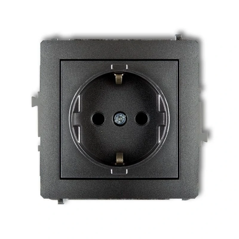 Gniazdo pojedyncze z uziemieniem schuko w kolorze grafitowym serii DECO firmy KARLIK, przeznaczone do montażu podtynkowego. Gniazdo wymaga dokupienia ramki serii DECO firmy KARLIK.