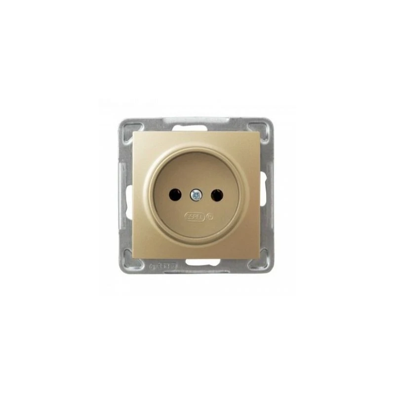 Pojedyncze gniazdo elektryczne bez uziemienia serii IMPRESJA firmy OSPEL przystosowane do montażu podtynkowego, koloru złotego. Gniazdo wymaga ramki serii IMPRESJA firmy OSPEL.