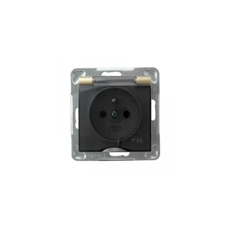 Pojedyncze gniazdo elektryczne bryzgoszczelne z uziemieniem w kolorze złotym serii IMPRESJA firmy OSPEL, przeznaczone do montażu podtynkowego. Gniazdo wymaga dokupienia ramki serii IMPRESJA firmy OSPEL.