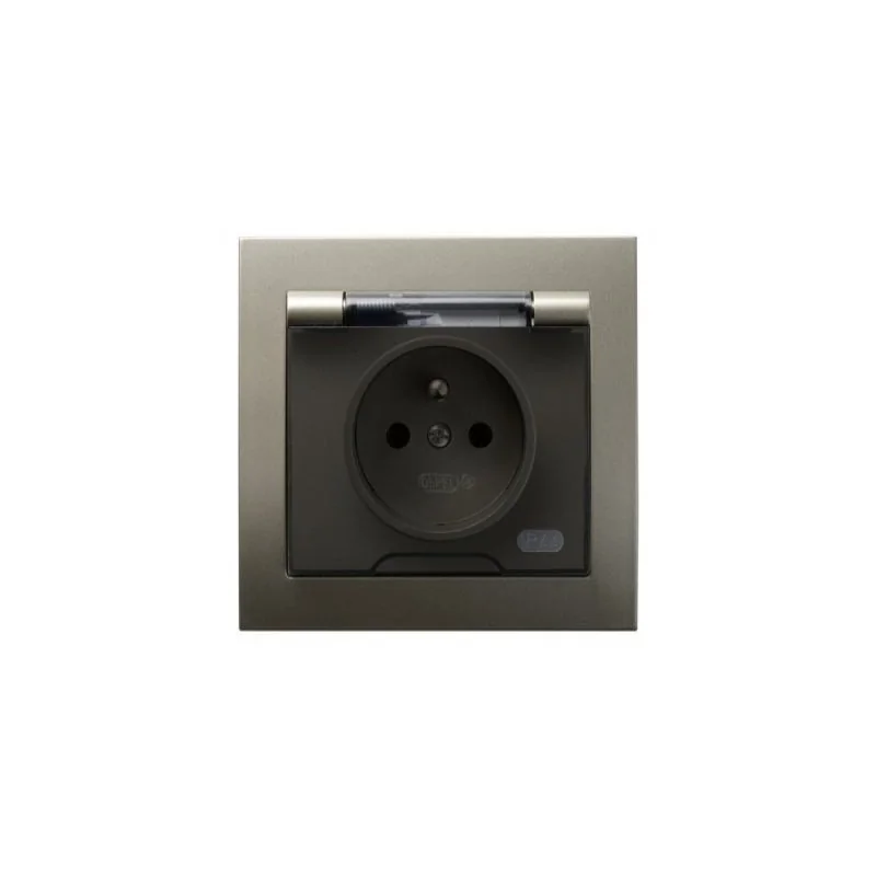 Pojedyncze gniazdo z klapką z uziemieniem w kolorze satynowym serii KIER firmy OSPEL, przeznaczone do montażu podtynkowego. Gniazdo posiada ramkę w komplecie.