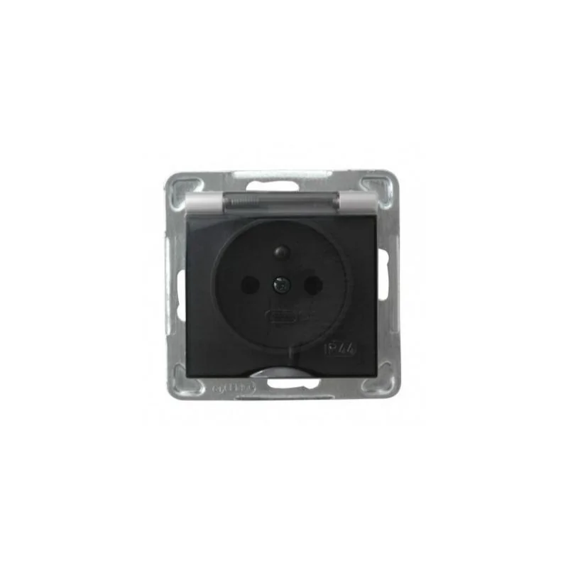 Gniazdo elektryczne bryzgoszczelne z uziemieniem w kolorze srebrnym serii IMPRESJA firmy OSPEL, przeznaczone do montażu podtynkowego. Gniazdo wymaga dokupienia ramki serii IMPRESJA firmy OSPEL.