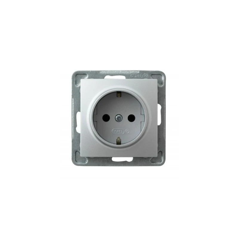 Gniazdo elektryczne pojedyncze z uziemieniem schuko serii IMPRESJA firmy OSPEL koloru srebrnego. Gniazdo wymaga dokupienia ramki serii IMPRESJA firmy OSPEL.