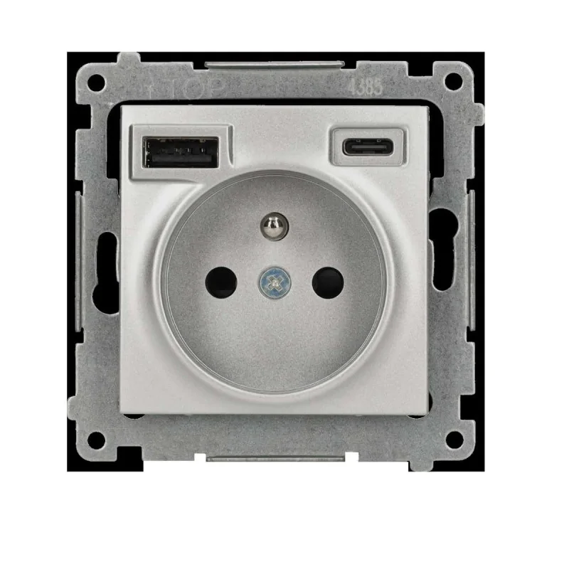 Gniazdo elektryczne z ładowarką USB, C+A, 2,1A, 16A, srebrny mat