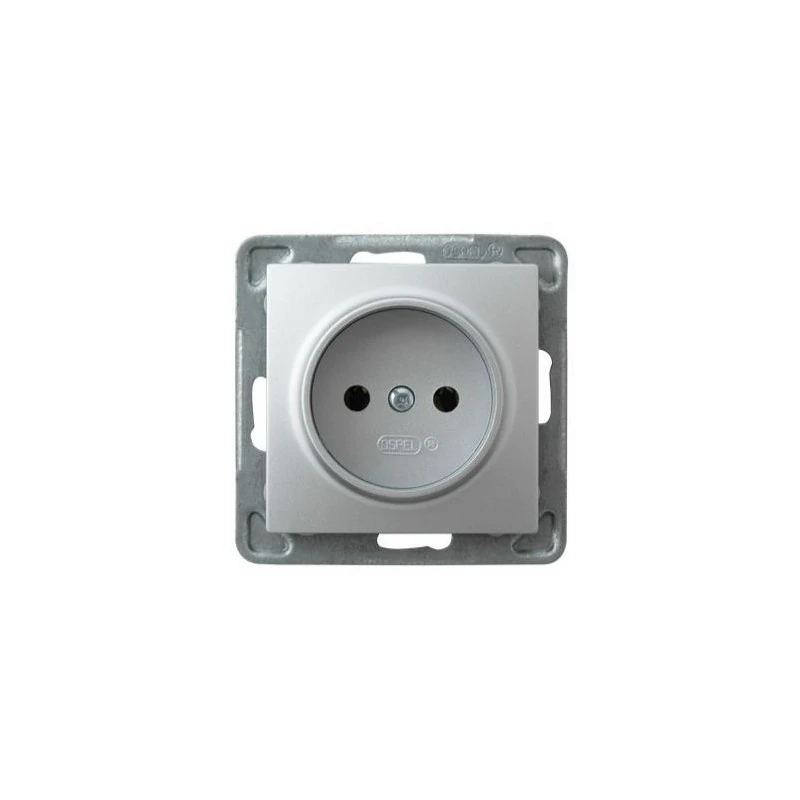 Pojedyncze gniazdo podtynkowe serii IMPRESJA firmy OSPEL w kolorze srebrnym, sposób montażu: podtynkowo. Gniazdo wymaga dokupienia ramki serii IMPRESJA firmy OSPEL.