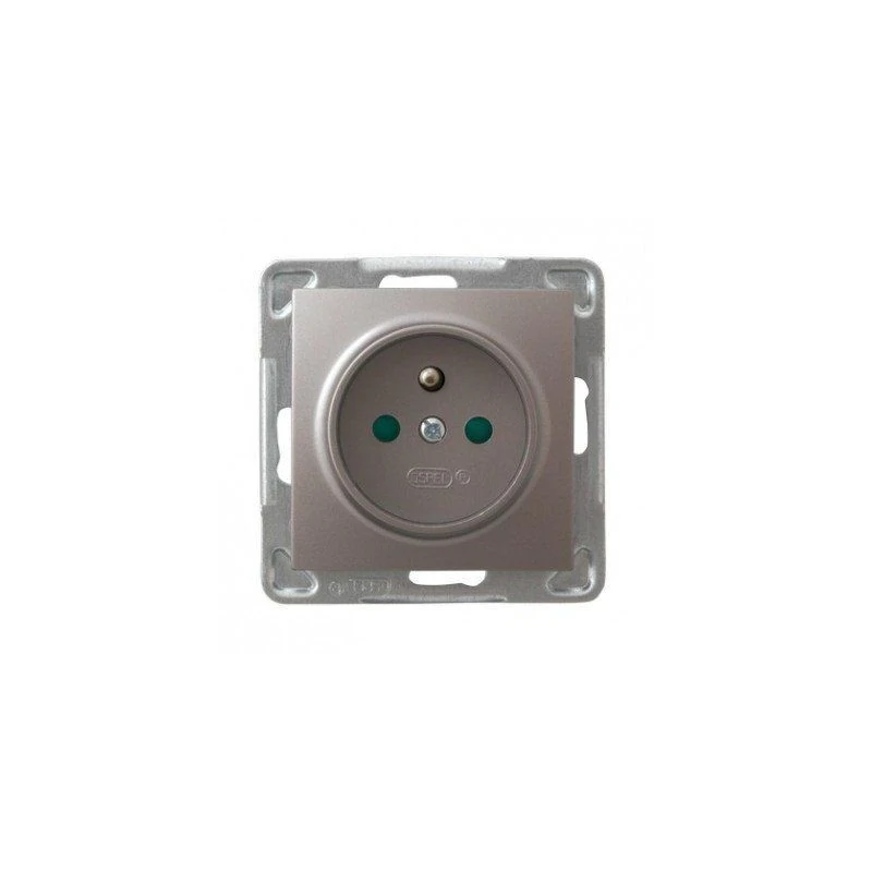 Tytanowe gniazdo elektryczne pojedyncze z uziemieniem serii IMPRESJA firmy OSPEL, przeznaczone do montażu podtynkowego. Gniazdo wymaga dokupienia ramki serii Impresja firmy Ospel.