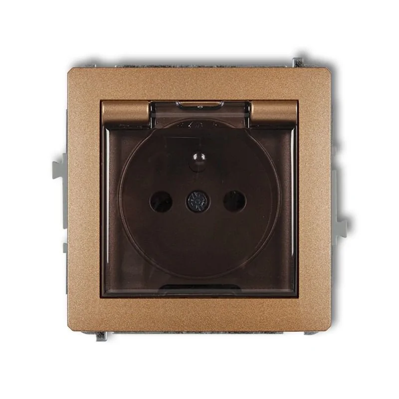 Gniazdo pojedyncze z klapką dymną, z uziemieniem serii DECO firmy KARLIK, w kolorze złotym, przeznaczone do montażu podtynkowego. Gniazdo wymaga dokupienia ramki serii DECO firmy KARLIK.