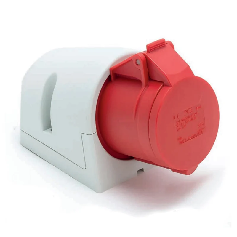 Gniazdo siłowe z pięcioma bolcami natynkowe, na stałe stanowisko. Gniazdo izolowane 16A wykonane z tworzywa sztucznego, ze stopniem ochrony IP 44. Czteropolowe gniazdo, posiada wejście na dławicę.