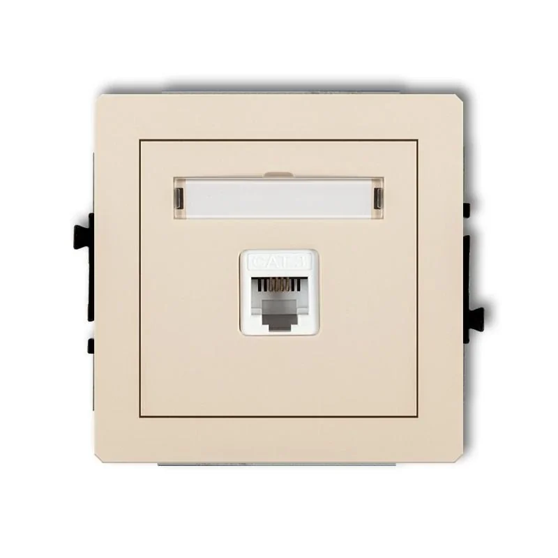 Gniazdo telefoniczne RJ11 koloru beżowego serii DECO firmy KARLIK, sposób montażu: podtynkowy. Gniazdo wymaga dokupienia ramki serii DECO firmy KARLIK.