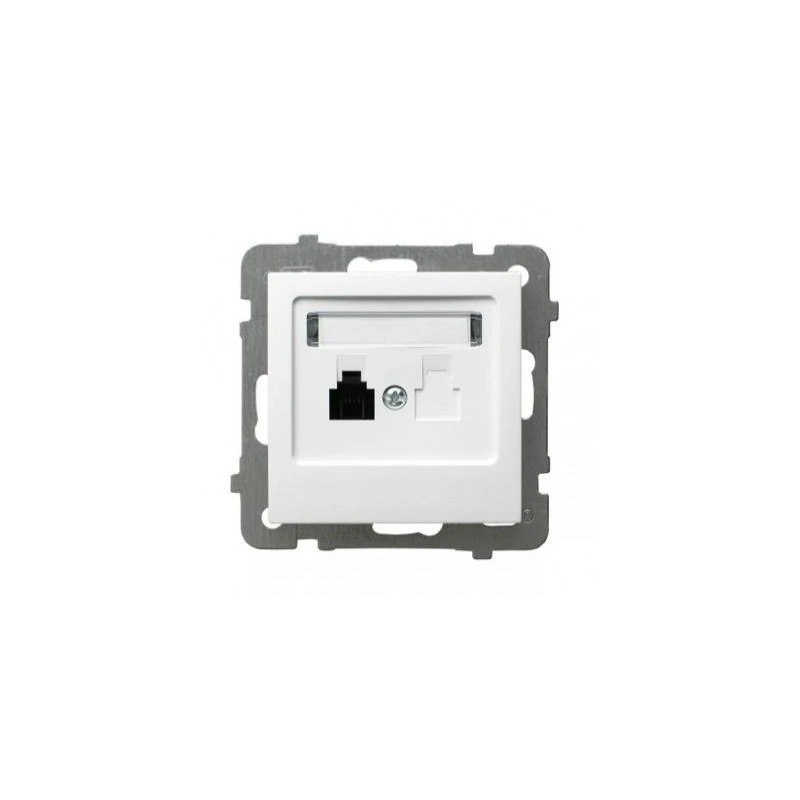 Gniazdo telefoniczne pojedyncze firmy OSPEL z serii AS o kolorze białym, sposób montażu podtynkowy.