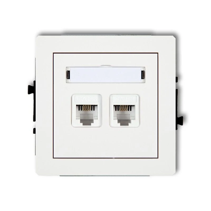 Podwójne gniazdo telefoniczne RJ11 koloru białego serii DECO firmy KARLIK, przeznaczone do montażu podtynkowego. Gniazdo wymaga dokupienia ramki serii DECO firmy KARLIK.