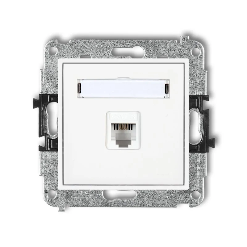 Białe gniazdo telefoniczne MGT-1 to gniazdo RJ11 do montażu podtynkowego. Pojedyncze gniazdo telefoniczne 4 stykowe to osprzęt niezbędny do obsługi klasycznego telefonu, bądź modemu komputerowego. Gniazdo na wtyki RJ MGT-1 przyda się do obsługi jednej linii telefonicznej. Gniazdo telefoniczne podtynkowe cechuje się estetycznym wyglądem na ścianie. Gniazdko do telefonu lub internetu możesz zamontować na korytarzu, w przedpokoju, w pokojach hotelowych lub innych miejscach, gdzie przewidujesz korzystanie z urządzeń przesyłających dane za pomocą sieci telefonicznej. Gniazdo wymaga dokupienia ramki z serii MINI.