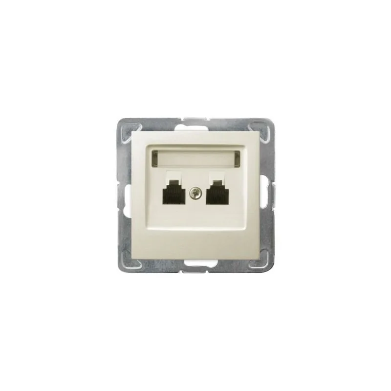 Podwójne gniazdo telefoniczne w kolorze ECRU serii IMPRESJA firmy OSPEL, przeznaczone do montażu podtynkowego. Gniazdo wymaga dokupienia ramki serii IMPRESJA firmy OSPEL.