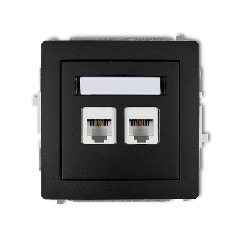 Gniazdo telefoniczne RJ11 podwójne koloru czarnego matowego serii DECO firmy KARLIK, przeznaczone do montażu podtynkowego. Gniazdo wymaga dokupienia ramki serii DECO firmy KARLIK.